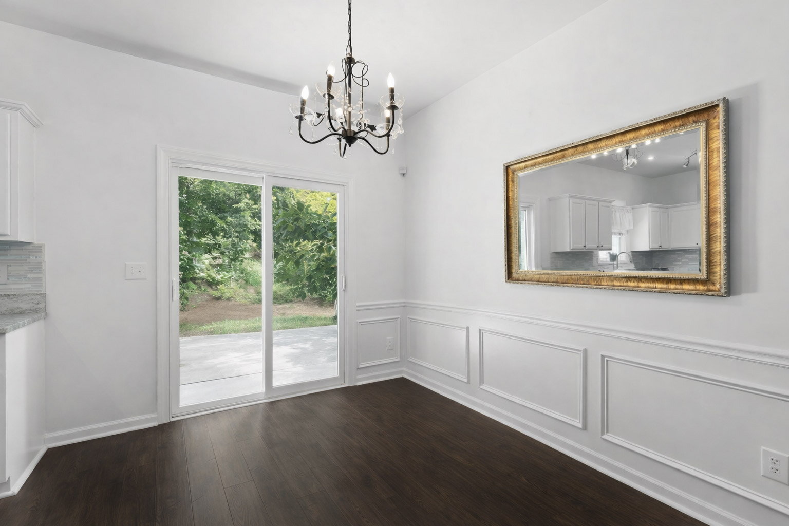 Dining Made Easy: A dedicated dining room sits just off the kitchen, complete with an elegant chandelier that creates the perfect setting for meals and gatherings.